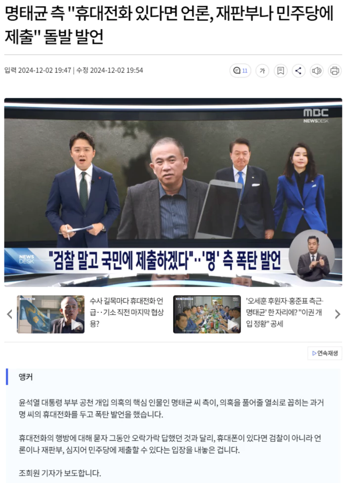 | 명태균·김영선 내일 기소.. 윤석열 부부 옛 휴대폰 증거보전청구 (28) | 2024.12.02 |