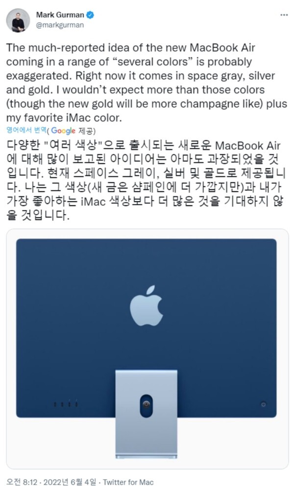 블룸버그의 Mark Gurman에 의하면 올해 출시 예정인 신형 맥북 에어가 다양한 색상 옵션으로 나올 것이라는 소문들과는 달리 기존 3색상(스페이스 그레이, 실버, 골드)와 새로운 블루 색상만 추가될 것이라는 전망을 트윗에 올렸습니다.