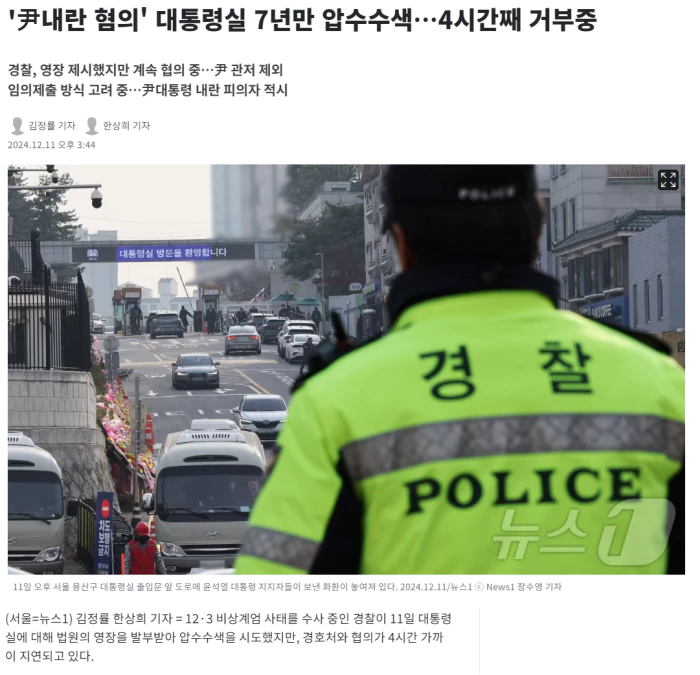 12·3 비상계엄 사태를 수사 중인 경찰이 11일 대통령실에 대해 법원의 영장을 발부받아 압수수색을 시도했지만, 경호처와 협의가 4시간 가까이 지연되고 있다.
