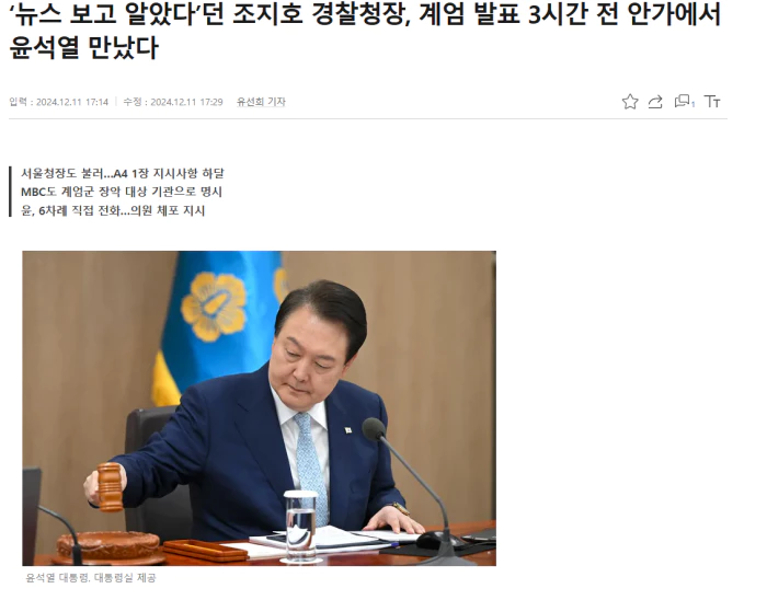 (출처 : [단독] ‘뉴스 보고 알았다’던 조지호 경찰청장, 계엄 발표 3시간 전 안가에서 윤석열 만났다 - 경향신문)