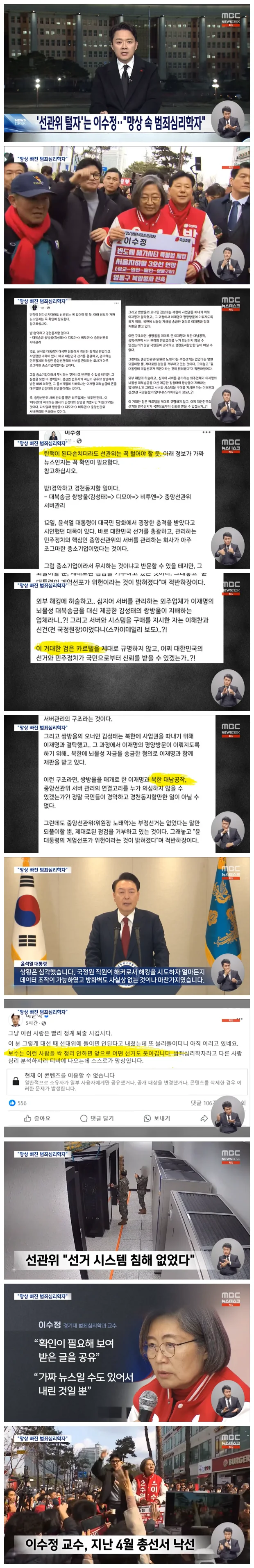 지난 대선 당시 국민의힘 공동선대위원장이었고 22대 총선에선 국민의힘 후보로 출마했던 이수정 경기대 범죄심리학과 교수가 부정선거 음모론을 담은 글을 공유했다가 삭제했습니다.