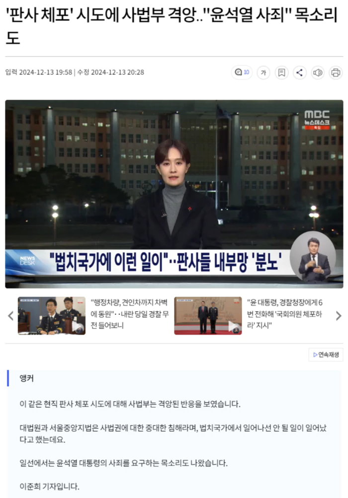 수도권의 한 판사는 "위헌, 위법하고 무도한 비상계엄은 사법을 겁박하여 무너뜨리려고 시도했다"면서 "윤석열은 김동현 판사와 사법부, 그리고 대한민국에 사죄하라"고 썼고, 서울의 한 판사는 "나도 우리도 김동현이다"는 제목의 글에서 "사죄가 아니라 법적 책임이 답"이라고 적었습니다.