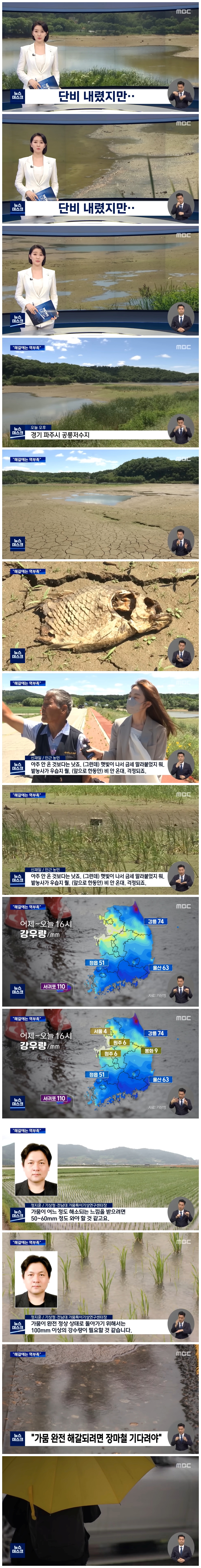 "가뭄이 어느 정도 해소되는 느낌을 받으려면 50~60mm 정도 와야 할 것 같고요. 가뭄이 완전 정상 상태로 돌아가기 위해서는 100mm 이상의 강수량이 필요할 것 같습니다."