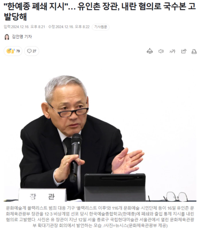 유인촌 문화체육관광부 장관이 12·3 비상계엄 선포 당시 한국예술종합학교(한예종)에 폐쇄, 출입 통제 지시를 내린 혐의로 고발됐다.