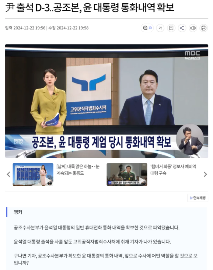 공수처가 경찰, 국방부와 함께 참여하고 있는 공조수사본부가 윤석열 대통령의 휴대전화 통화 내역을 확보한 것으로 전해졌습니다.
