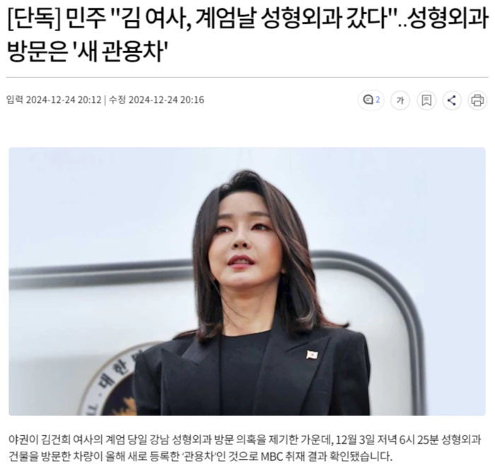 더불어민주당 장경태 의원은 어제 기자회견을 열고 “12월 3일 오후 6시 25분에 성형외과에 들어가 계엄 선포 1시간 전인 9시 30분까지 3시간 동안 성형외과에 있었다”고 주장했습니다.