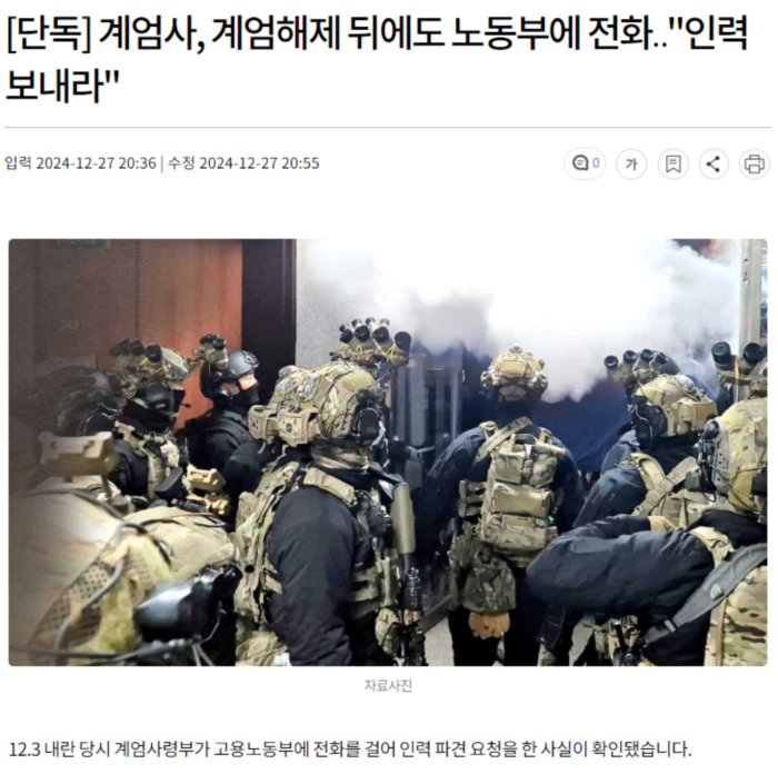 계엄사는 12월 3일 밤 포고령을 통해 '사회혼란을 조장하는 파업, 태업, 집회행위를 금한다'고 발표했는데, 실제로 포고령을 이행하기 위해 고용노동부에 인력 파견을 요청한 것 아니냐는 해석이 나옵니다.