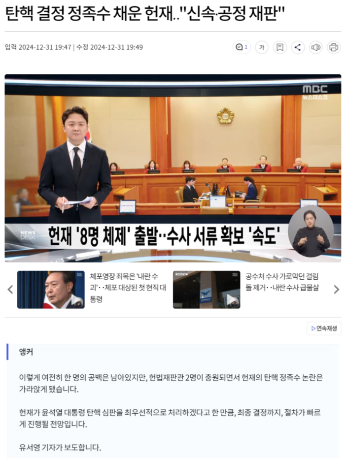 오늘 2명이 충원되면서 헌재가 어떤 결론을 내리든 절차적 정당성은 어느 정도 확보한 셈입니다.