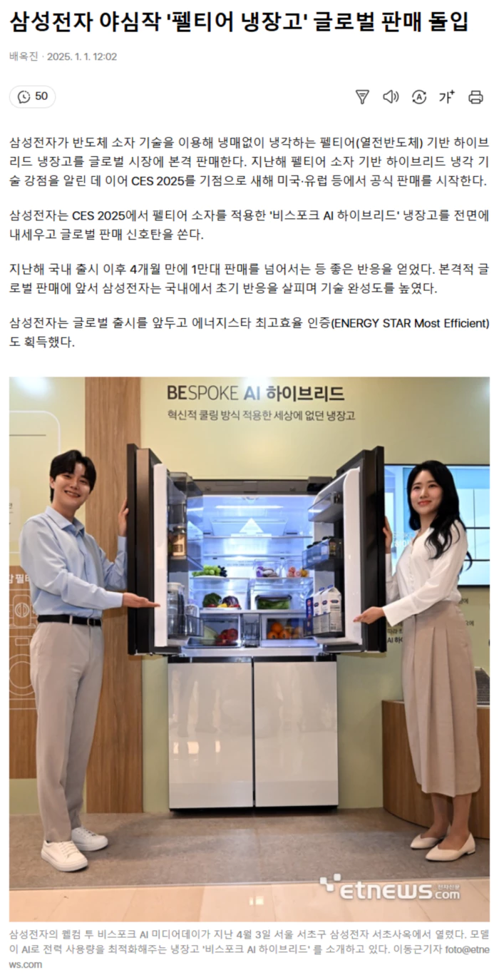 (출처 : 삼성전자 야심작 '펠티어 냉장고' 글로벌 판매 돌입)