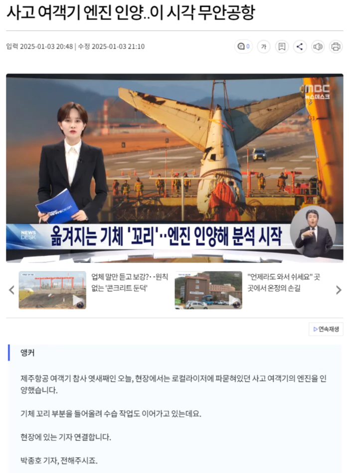 국토부 항공철도사고조사위원회는 오늘 로컬라이저 아래 둔덕에 묻혀있던 엔진 한쪽도 인양했습니다.