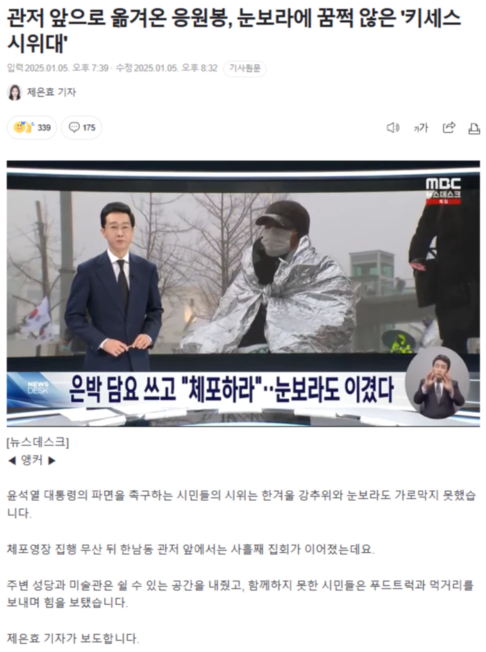 ◀ 리포트 ▶ 밤샘 시위 끝에 쏟아진 눈보라를 시민들은 피하지 않았습니다. 추위에 두른 은박 담요 위로 눈이 쌓여 가도 자리를 지켰고, 구호를 외쳤습니다. [정나래] "'키세스' 같이 이 은박 담요에 위에 눈이 이렇게 쌓이는 거예요. 이게 뭐 하는 짓이지 그런 생각이 약간 들면서…주변에 다 이제 키세스 위에 슈가파우더가 뿌려지는 그런 광경…" "윤석열을 체포하라 <체포하라 체포하라 체포하라>" 체포영장 집행이 실패한 뒤 시민들은 한남동 관저 앞으로 옮겨왔고 밤을 꼬박 샌 겁니다. [이춘성] "경호원이 5백 명이 있으면 (경찰은) 1천 명 1천5백 명 데리고 들어왔어야지. 120명을 갖고 윤 대통령을 어떻게 체포합니까. 내란범을 체포해야 되는 게 맞잖아요. 그게 국민이 바라는 거잖아요." 여의도 탄핵안 가결을 이끌었던 주역들도 응원봉과 함께 옮겨왔습니다. [임청한] "응원봉을 들고 2030 여성들이 모이기 시작한 것에서 시작이 되었는데…연대 마음이 커지니까 두려움이나 추위가 점점 잊혀가더라고요." 낮 시간에도 눈이 계속 내리고 있는데요. 시민들은 여전히 밖에서 윤석열 대통령을 체포하라고 외치고 있습니다. 분노의 목소리는 더 커졌습니다. [김나은] "이제는 더 이상 참을 수 없습니다. 국민을 외면하고 책임을 다하지 않는 윤석열 대통령을 우리는 강력히 파면해야 합니다." [권하은] "혼자서 따뜻한 방에서 온수도 전기도 와이파이도 안 끊긴 채로 사니까 얼마나 억울해요. 제발 좀 빨리 내려와가지고 자기의 죄를 인정했으면 좋겠습니다." 근처 성당과 미술관은 잠시 나마 몸을 녹일 공간과 화장실을 흔쾌히 내어줬습니다. 함께하지 못한 시민들은 이번에도 한남동 관저 앞으로 따뜻한 차와 먹거리를 보내 왔습니다. "홍차랑 뽕잎차. <홍차 하나, 뽕잎차 하나>" [양효진] "핫팩 계속 나눠주시는 분들 정말 많으셨고 그리고 김밥도 하나 받았거든요. 저녁을 못 먹었는데 집회에 계속 있느라…김밥 먹고 정말 많은 힘을 낼 수 있었던 것 같습니다." 아예 푸드 트럭을 보낸 시민도 있습니다. [김복순] "배고프면 더 춥잖아요. 이거라도 먹으니까 따뜻하고 좋네요. 부부가 왔는데요. 나오니까 좋네요. 마음이 좀 트여요. 답답했는데…" .. 후략 ..