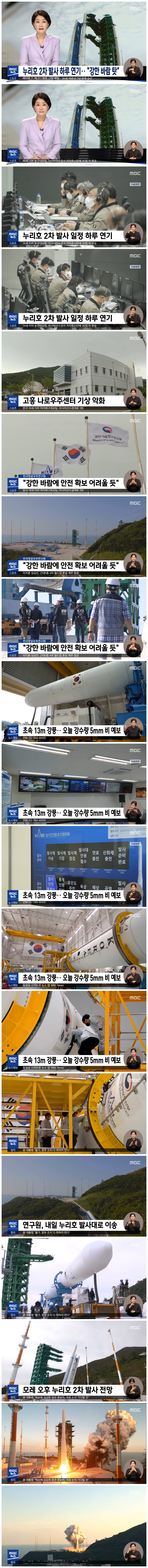 당초 내일로 예정됐던 한국형 발사체 누리호의 2차 발사가 기상 악화로 하루 연기됐습니다.