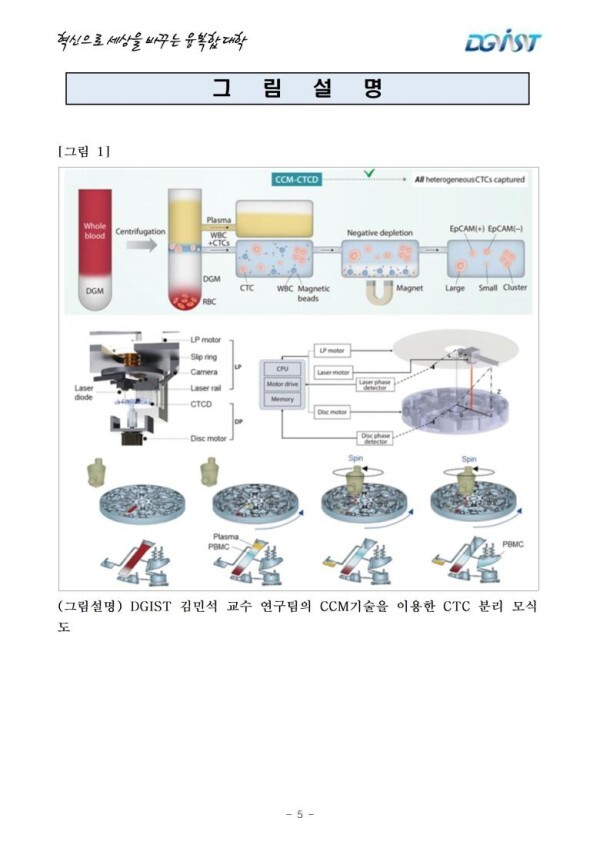 □ DGIST(총장 국양) 뉴바이올로지학과 김민석 교수팀은 연속원심미세유체 원천기술을 개발하여 세계 최초로 혈액 내 존재하는 모든 종류의 암세포들을 분리할 수 있는 자동화 장치를 개발하였다고 밝혔다. 해당 기술은 모든 종류의 암세포를 분리할 수 있고, 초정밀 암진단이 가능하며 이를 완전 자동화 형태로 구현하여 병원에서 바로 활용 가능할 정도로 완성도가 높다고 할 수 있다.