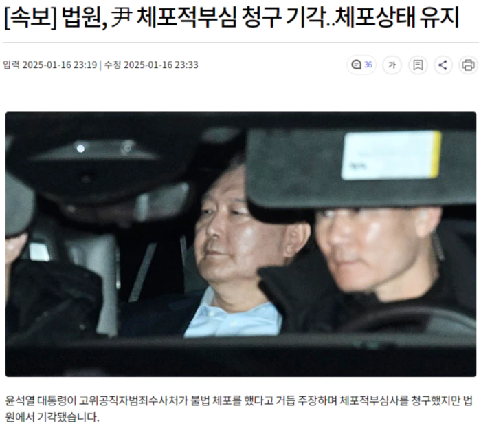 서울중앙지법 형사32단독 소준섭 판사는 오후 5시부터 2시간 동안 체포적부심사를 진행한 뒤 윤 대통령의 청구를 기각했습니다.