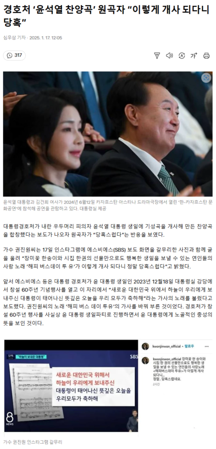 경호처는 이 자리에서 유명 뮤지컬 ‘렌트’의 ‘시즌스 오브 러브’라는 노래를 개사해 ‘84만5280분 귀한 시간들 오로지 국민만 생각하는 당신’이라는 가사의 노래도 불렀다.