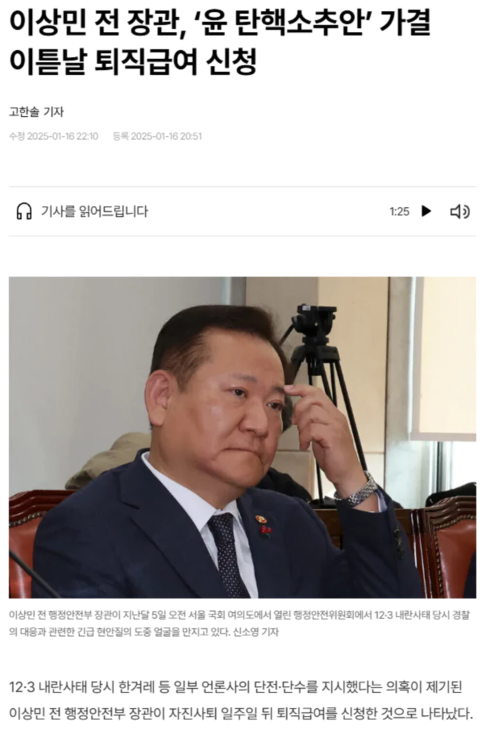 16일 국회 행정안전위원회 소속 양부남 더불어민주당 의원실이 행안부와 공무원연금공단에서 받은 자료를 보면, 이 전 장관은 지난달 15일 퇴직급여 청구서를 공단에 접수했다. 이 전 장관이 청구서를 접수한 건 12·3 내란사태로 탄핵소추 위기에 몰리자 지난달 8일 자진사퇴한 지 일주일 만이다. 윤 대통령의 탄핵소추안이 국회 본회의에서 가결돼 대통령 직무가 정지된 바로 다음날이기도 하다.