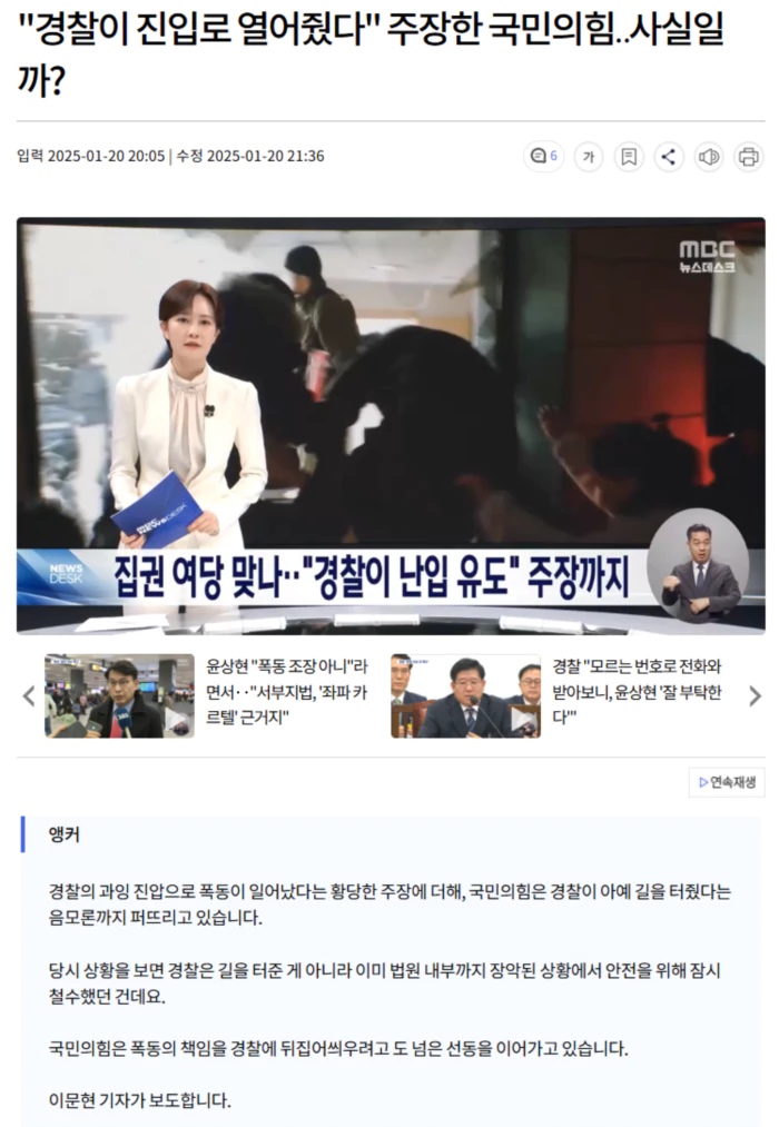 국민의힘은 "경찰이 갑자기 시위대가 진입할 수 있도록 길을 터줬다고 한다"고 주장하며, 난동을 경찰 탓으로 몰아갔습니다.