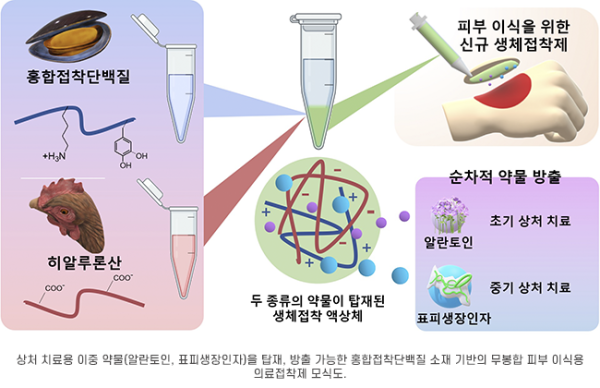화학공학과 차형준 교수·박우형 석사·통합과정 이재윤 씨 연구팀은 한국화학연구원 김효정 박사와의 공동연구를 통해 두 가지 약물이 담긴 피부 이식용 의료접착제를 개발했다.