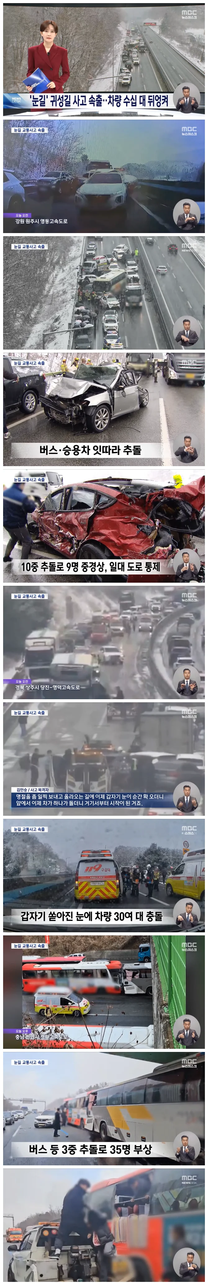 영동고속도로에서는 10중 추돌사고가, 당진 영덕 고속도로에서는 차량 28대가 연이어 부딪혔습니다.