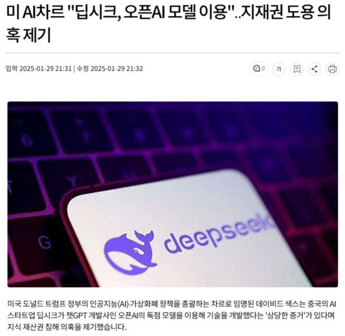 색스는 "딥시크가 오픈AI 모델에서 지식을 증류했다는 상당한 증거가 있다"며 "오픈AI가 이에 대해 매우 만족하지는 않을 것 같다"고 말했습니다.