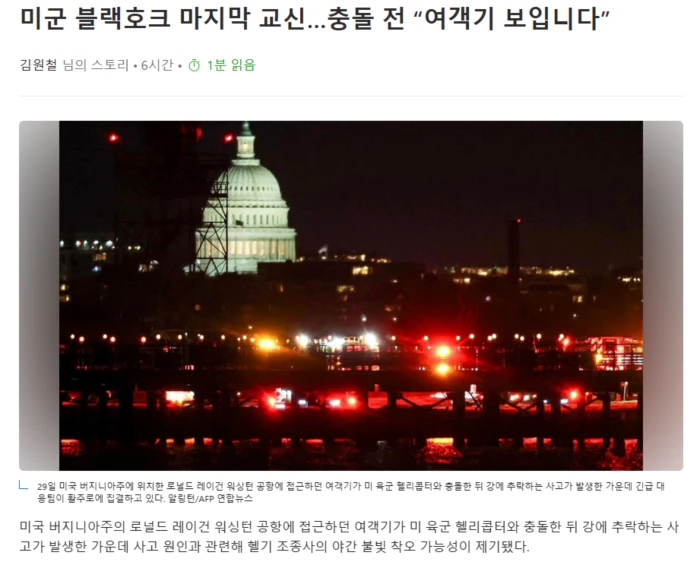 미국 에이비시(ABC) 뉴스는 29일(현지시각) 밤 공항 관제사와 사고 헬기 조종사 간 교신 내역으로 추정되는 녹음을 입수했다고 보도했다. 교신에서 관제사는 헬기 조종사에게 “당신이 주의해야 할 항공기는 지역항공사 항공기다. 보이느냐”고 물었다. 헬기 조종사는 “네, 보입니다”라고 답했다. 관제사는 “해당 항공기와 시각적 분리를 유지하라”고 말한 뒤 “그 항공기 뒤쪽으로 이동하세요”라고 지시했다. 하지만 이 지시는 이행되지 않았다. 에이비시는 항공 전문가를 인용해 “헬기 조종사가 시각적 착각을 일으켰을 가능성이 있다”며 “밤에는 수천개의 불빛이 지평선에 있기 때문에 다른 항공기나 불빛을 자신이 피해야 할 항공기로 잘못 식별했을 수 있다”고 보도했다. 블랙호크 헬리콥터에는 충돌 경고 시스템이 장착돼있지 않다. 블랙호크 조종사 출신 타미 덕워스 민주당 상원의원은 엠에스엔비시(MSNBC)에 출연해 “(경고시스템은 없지만) 블랙호크 헬리콥터는 조종석 위, 아래, 그리고 양옆에 창문이 있어 거의 파노라마 수준의 시야를 제공한다. 이는 대형 제트기의 시야보다 훨씬 뛰어나다”며 “이런 사고가 발생했다는 것이 꽤 놀랍다”고 말했다. .. 후략 ..