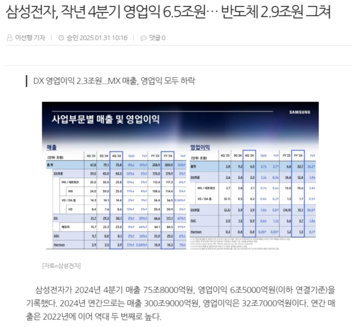 (출처 : 삼성전자, 작년 4분기 영업익 6.5조원… 반도체 2.9조원 그쳐 - 전자부품 전문 미디어 디일렉)