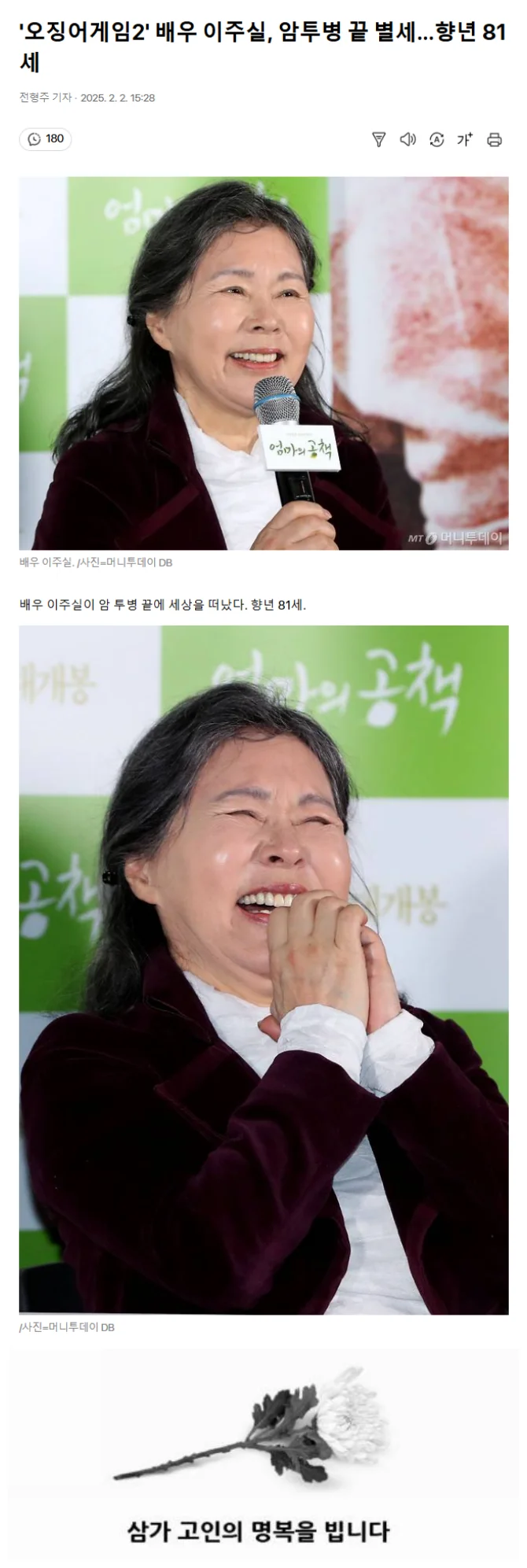 고인은 영화 '명량', '사바하', '부산행', 드라마 '경이로운 소문2', '구해줘2' 등 작품에서 조연으로 활약했다. 특히 최근 공개된 화제작 '오징어게임 시즌2'에서 프론트맨(이병헌 분), 경찰 황준호(위하준 분)의 어머니 역을 맡기도 했다.