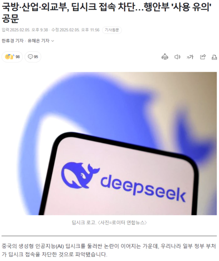 오늘(5일) 국방부와 산업통상자원부, 외교부는 이같이 조치한 것으로 전해졌습니다. 딥시크가 학습 과정에서 이용자 정보 등을 과도하게 수집한다는 논란 속에 이뤄진 조치입니다. 산업부 관계자는 "어제(4일) 행정안전부가 생성형 AI 사용에 유의해 달라는 가이드라인을 줬다"며 "자체 판단에 따라 외부 접속이 가능한 컴퓨터에서 딥시크를 임시 차단했다"고 설명했습니다. 국방부 관계자는 "본청과 각 군 부대에서 쓰는 업무용 컴퓨터에서 딥시크 접속을 차단했다"며 "개인 휴대전화 등에 대해선 차단이 아닌 유의 조치만 내려졌다"고 했습니다. 외교부는 "관련 부처에서 전반적인 보안성을 검토 중인 것으로 알고 있다"면서도 "외교부 차원에서 취한 구체적인 보안 조치 내용에 관해선 확인해 줄 수 없다"는 입장을 밝혔습니다. 앞서 행정안전부는 어제(4일) 중앙부처와 17개 광역지방자치단체에 딥시크와 챗GPT 등 생성형 AI 사용에 유의해 달라는 공문을 보냈습니다. .. 후략 ..