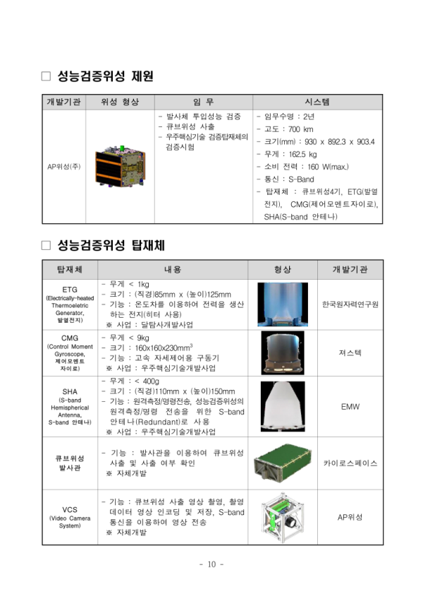 ㅇ 성능검증위성에는 국내 기술로 개발된 발열전지, 제어모멘트자이로, S-Band 안테나가 탑재되어 있는데, 성능검증위성의 운용기간 동안 이러한 탑재체가 실제 우주환경에서 설계된 성능을 잘 발휘하는지에 대해 확인할 예정이다.