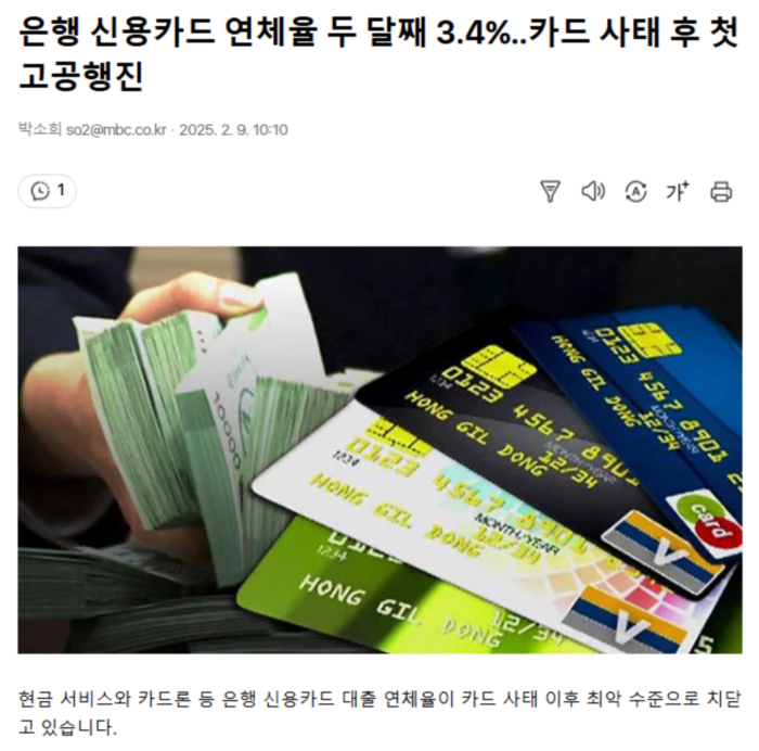 한국은행 경제통계시스템에 따르면 일반은행의 신용카드 대출금 연체율은 지난해 10월 말에 이어 11월 말에도 3.4%로 집계됐습니다.