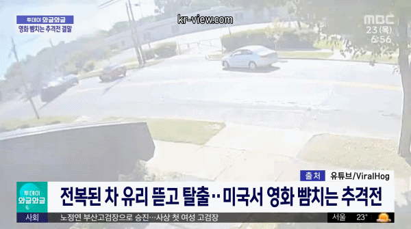 미국 뉴욕 로체스터 한 주택가에서 경찰과 범죄자 간의 추격전이 벌어졌는데, 범죄자들이 탄 차량이 속도를 줄이지 못하고 모퉁이를 돌다 전복된 겁니다.