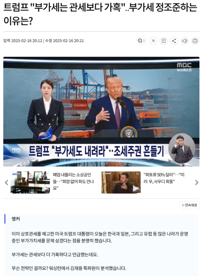 수입차에 대한 상호관세를 4월부터 부과할 태세인 트럼프 대통령이 이번엔 유럽과 한국, 일본 등 170개국 이상이 쓰고 있는 부가가치세를 정조준했습니다.