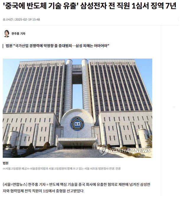 서울중앙지법 형사합의25부(지귀연 부장판사)는 19일 산업기술보호법 위반 등 혐의로 구속기소 된 전직 삼성전자 부장 김모씨에게 징역 7년과 벌금 2억원, 협력업체 A사 직원 방모씨에게 징역 2년 6개월을 선고했다.