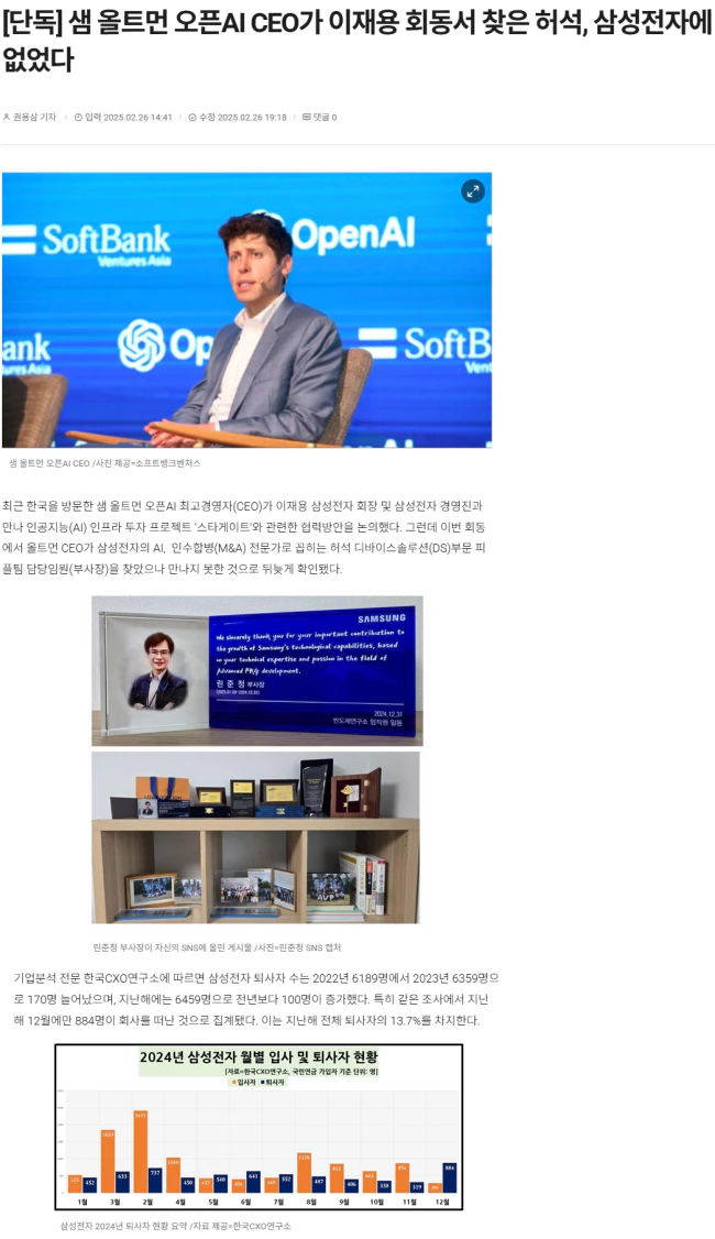 그러나 올트먼 CEO가 찾았던 허 부사장은 이미 삼성전자를 퇴사한 뒤였다. 이 회장이 현장에서 주변 경영진에 그의 거취를 물었으나 누구도 답을 하지 못했다는 후문이다.