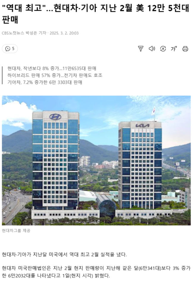 역대 2월 기준 최고치로, 올 1~2월 합계 판매량은 작년보다 8% 증가한 11만6535대에 달했다. 모델별로는 싼타페 하이브리드(HEV) 판매량이 작년 2월보다 194% 증가한 것을 비롯해 투싼과 아이오닉6 판매량이 각각 2%와 12% 증가했다. 하이브리드 차종 판매량은 전년보다 57% 늘어났고 전기차(EV) 판매도 35% 증가했다. 지난 1월 투싼 1.6 HEV 모델은 국내 생산 8338대 가운데 71%에 달하는 5905대가 수출됐고, 싼타페도 1.6 HEV 생산량 중 35%가 수출됐다. 랜디 파커 현대차 미국판매법인 최고경영자(CEO)는 "투싼을 중심으로 한 높은 판매량과 전기차 및 하이브리드 성장 덕분에 5개월 연속 판매 기록을 경신했다"며 "시장 점유율을 더욱 확대하고 고객 기대를 충족할 것"이라고 말했다. 기아 미국판매법인도 지난 2월 현지에서 6만3303대를 판매, 실적이 작년 동월 대비 7.2% 증가했다고 이날 밝혔다. 역시 2월 기준 역대 최고 기록이다. 1~2월 누적으로는 12만310대로 역대 연간 최고를 기록했던 지난해 같은 기간보다 9.2% 많았다. 지난해 8월 출시한 올 뉴 K4 컴팩트가 1만1669대를 판매하며 성장세를 이끌었다. 카니발 MPV(44%)와 스포티지(8%), 텔루라이드(13%) 등 주요 SUV(스포츠유틸리티차) 모델도 호조를 보였고, 전기차 모델 라인업 판매도 전년 대비 22% 증가했다. .. 후략 ..