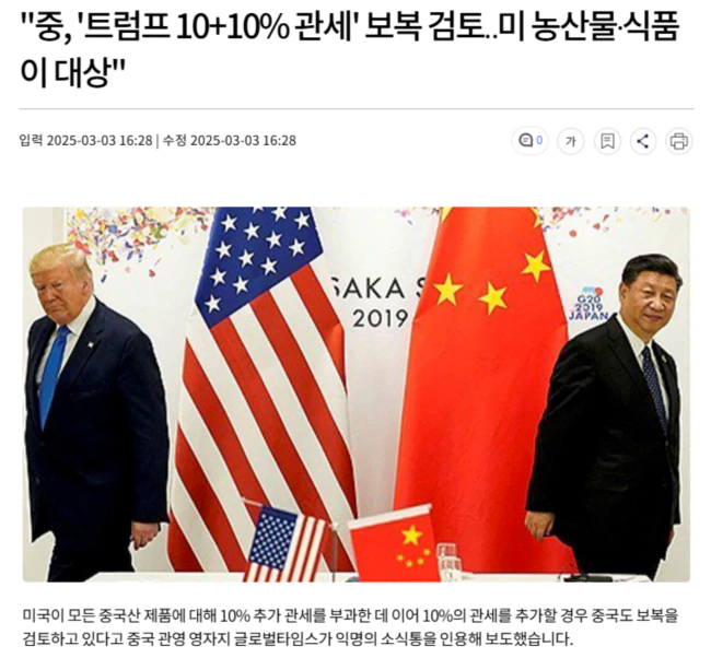 보도에 따르면 중국 정부의 맞대응책에는 관세 및 비관세 조치가 모두 포함될 가능성이 크며, 미국산 농산물과 식품이 우선순위에 올라가 있습니다.