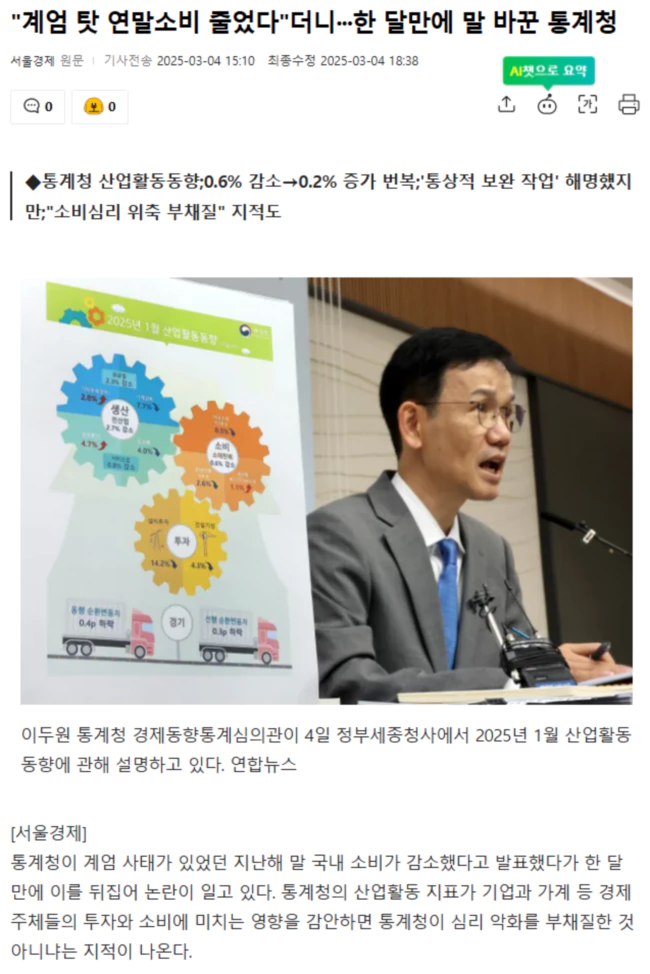 통계청은 4일 발표한 ‘1월 산업동향’에서 지난해 12월 소매판매가 전월 대비 0.2% 상승했다고 밝혔다. 한 달 전인 ‘2024년 12월 산업동향’ 발표 당시 통계청은 똑같은 소매판매를 두고 이 기간 0.6% 감소했다고 밝힌 바 있다. 통상 12월은 크리스마스 같은 계절적 특수에 연말 효과까지 겹쳐 소비가 늘어나는 경우가 많다. 하지만 지난해에는 이런 흐름에서 벗어나자 윤석열 대통령의 12·3 비상계엄 선포와 제주항공 참사 등이 엎친 데 덮치면서 소비가 위축됐다는 해석이 뒤따랐다.