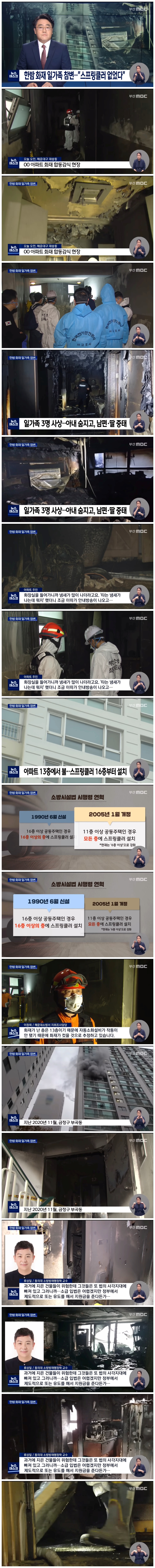 20년 가까이 된 이 아파트는 스프링클러 의무 설치가 일부 층에만 적용돼, 화재가 난 층에는 소방시설이 아예 설치돼 있지 않았습니다.