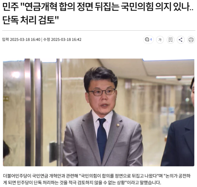 민주당 진성준 정책위의장은 연금개혁 관련 브리핑을 열고 "국민의힘이 국회 연금개혁 특위 구성과 운영의 원칙이 전제돼야, 다시 말해 '합의처리' 원칙이 전제돼야 모수개혁도 논의한다는, 오전 회의와 전혀 상반되는 입장을 말했다"며 "여야가 20일 본회의에 연금개혁안을 상정해 처리하자는 합의를 이행할 수 있을지 걱정스럽다"고 우려했습니다.