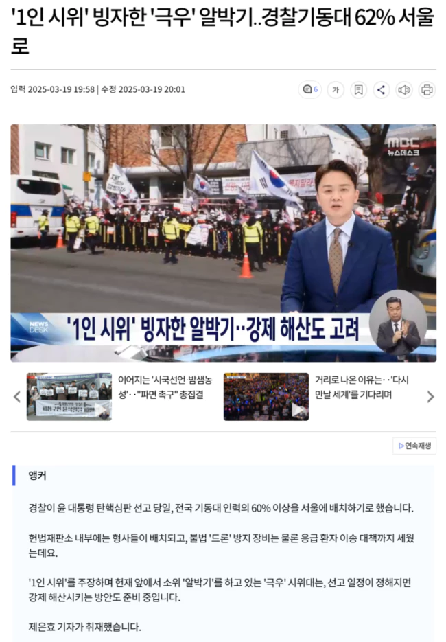 선고 당일 헌법재판소 주변 100미터를 이른바 '진공 상태'처럼 만들기로 한 경찰은, 선고 일정이 정해지면 '1인 시위'를 빙자해 '알박기'를 하고 있는 '극우' 시위대를 퇴거시키는 방안을 준비하고 있습니다.
