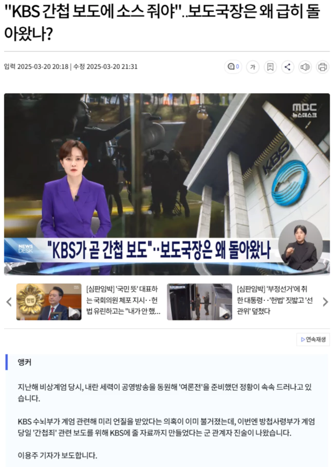 계엄 선포 계획에 대해 KBS 수뇌부가 미리 언질을 받은 게 아니냔 의혹이 불거졌습니다.
