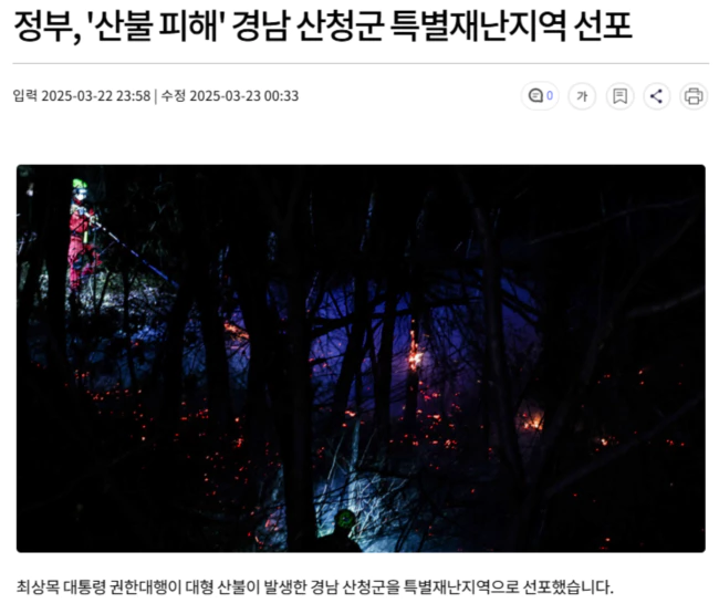 사흘째 산불이 잡히고 있지 않자, 정부 차원의 신속한 수습과 피해자 지원을 위해 내린 조치로, 특별재난지역이 되면 산불로 피해를 본 사유시설 및 공공시설 복구 비용 일부를 국비로 지원받을 수 있게 됩니다.
