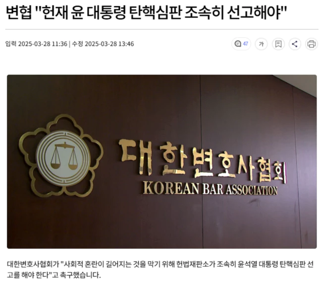 변협은 오늘 성명서를 내고 "윤 대통령의 탄핵심판 선고가 지연되면서 사회적 혼란이 가중되고 있다"며 이같이 밝혔습니다.