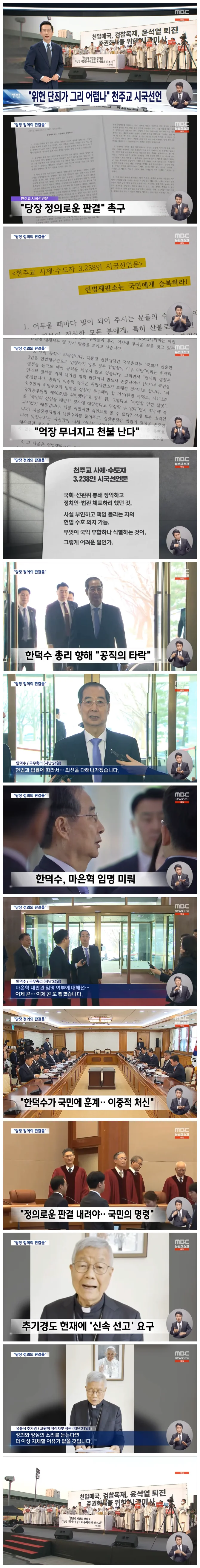 3천 명이 넘는 사제와 수도자들은 사회 혼란이 임계점을 넘었다며 헌재에 빠르고 올바른 선고를 촉구하고, 말로만 '헌법 존중'을 주장하는 한덕수 총리의 이중성이 이번 사태를 키웠다고 비판했습니다.