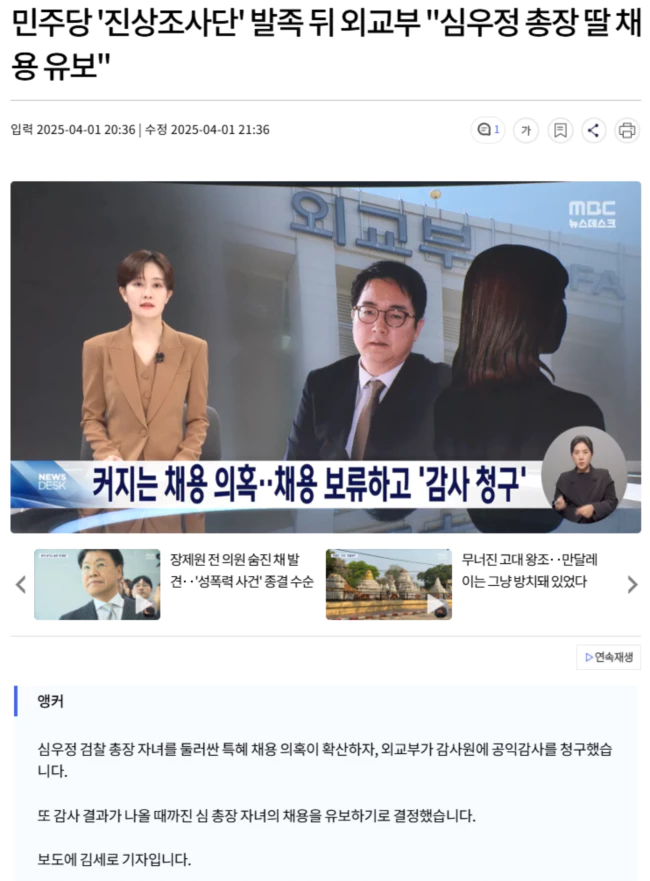 외교부는 오늘 특혜 채용 의혹이 제기된 심우정 총장 딸의 채용을 유보하고, 감사원에 공익 감사를 청구했다고 밝혔습니다.