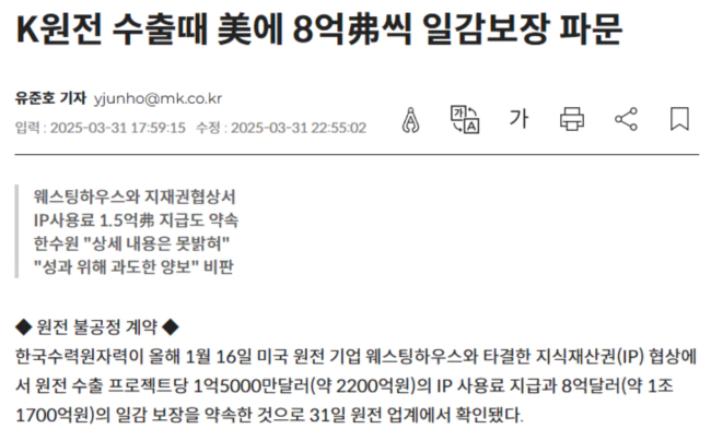 (출처 : K원전 수출때 美에 8억弗씩 일감보장 파문)