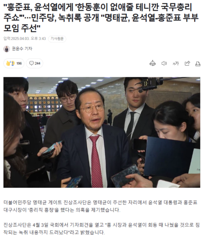 "홍준표, 윤석열에게 '한동훈이 없애줄 테니깐 국무총리 주쇼'".. 민주당, 녹취록 공개 "명태균, 윤석열-홍준표 부부 모임 주선"