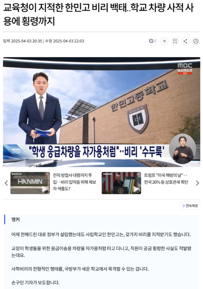 교육당국이 밝힌 한민고의 비리는 다양합니다.