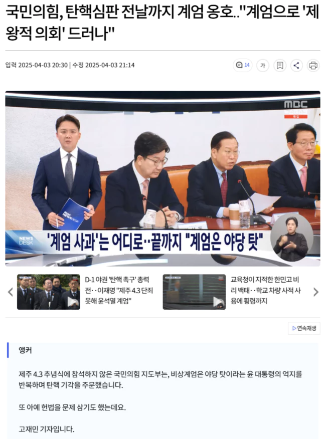 지난해 비대위로 전환하며, "비상계엄으로 불안을 드려 사과한다"고 밝힌 지도부가, 윤 대통령이 심야에 계엄군을 투입했던 바로 그 국회의사당에서, 여전히 비상계엄의 논리를 설파한 겁니다.