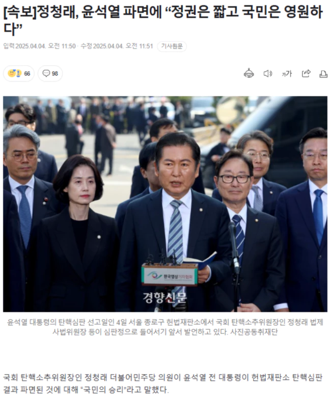 (출처 : [속보]정청래, 윤석열 파면에 “정권은 짧고 국민은 영원하다”)